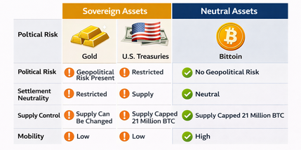 Gold / U.S. Treasuries / Bitcoin across dimensions ofPolitical Risk, Settlement Neutrality, Supply Control, Mobility