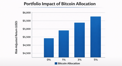 Bar chart showing risk-adjusted returns with 0%, 1%, 3%, and 5% Bitcoin allocation (all values in USD terms)