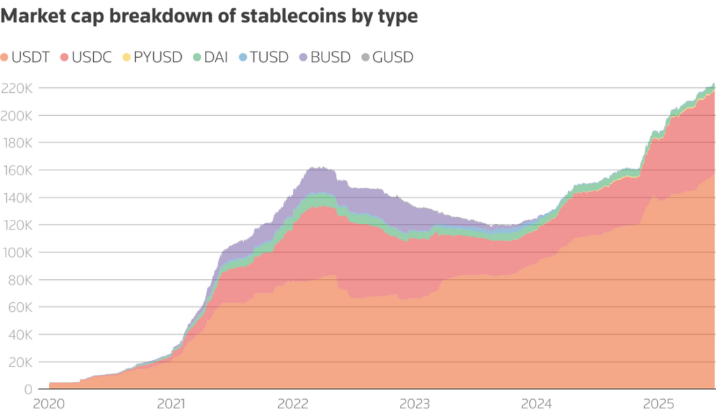 Suggested chart: A line graph showing total stablecoin supply (USD) from 2021–2025, highlighting the sharp increase in 2024–2025.