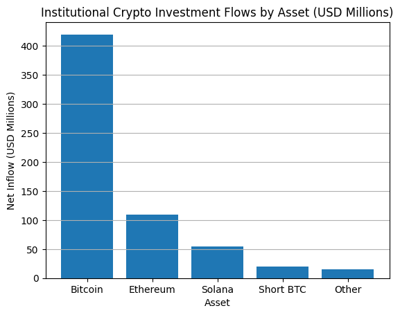 Ethereum (ETH) and Solana (SOL) were the most prominent beneficiaries among non-Bitcoin digital assets. Investment products tied to these networks saw relatively strong capital inflows compared to other altcoins.