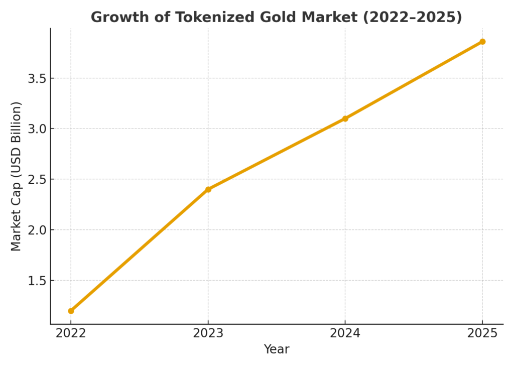 - The market for tokenised gold assets has swollen to around US $3.86 billion, led by tokens such as Tether Gold (XAUT) and PAX Gold (PAXG).
