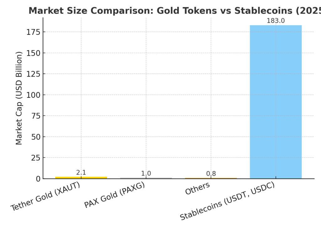 Consequently, these tokens are being pitched as alternative hedges, possibly more accessible than physical gold bullion for everyday crypto users. However, the relative size of the market remains tiny when contrasted with major stablecoins: for example, one article cites that even XAUT’s market cap is just US $2.1 billion versus USDT’s ~US $183 billion.