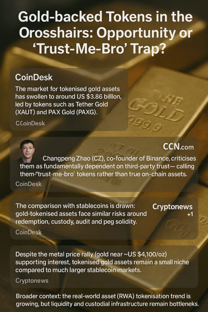 - Custody and redemption risk matter – Unlike native assets which rely purely on on-chain code/trustless settlement, tokenised gold introduces off-chain dependencies. If an issuer mismanages or an audit fails, token value could diverge from physical backing. CZ’s critique serves as a strong caution.