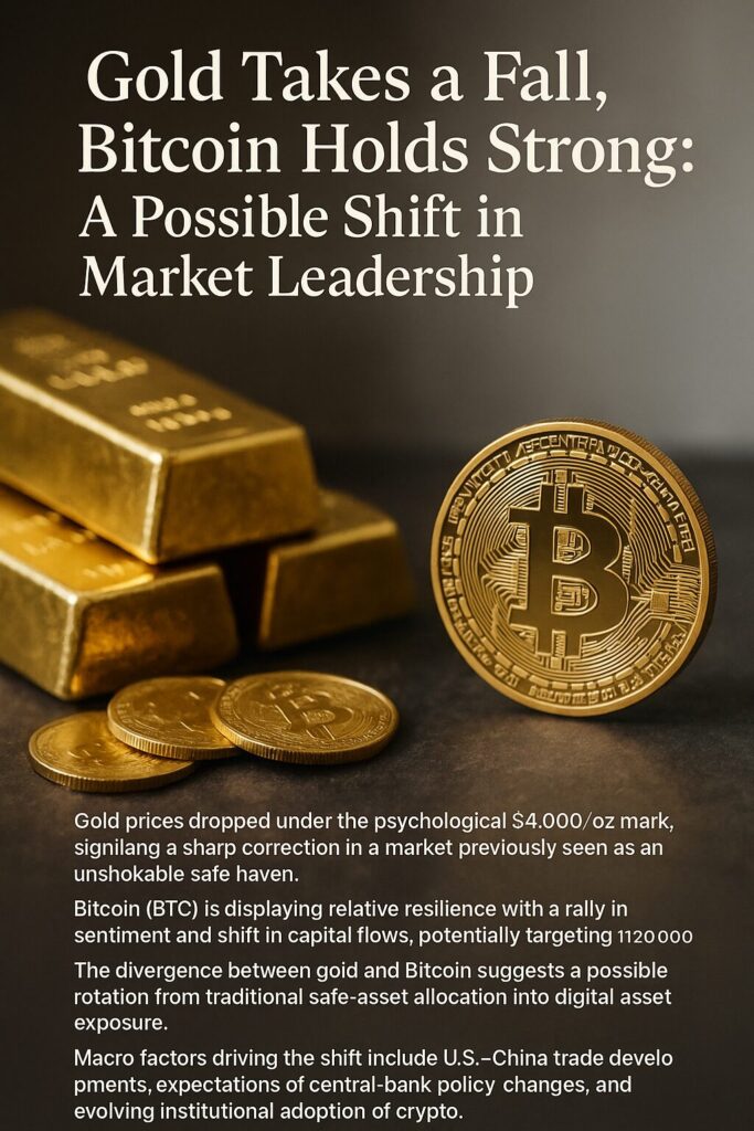 What we may be witnessing is a capital rotation: money departing from traditional safe assets (like gold) and migrating toward higher-risk / higher-reward digital alternatives (like Bitcoin). The juxtaposition is clear: gold down ~9% from peak, Bitcoin up 6.7% over the same period per one analyst’s tracking.