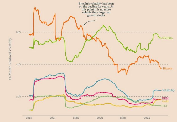 A defining feature of Bitcoin’s current phase is declining volatility—a trend that would have seemed unthinkable just a few years ago.