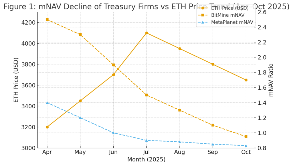 - NAV premium compression: Ethereum treasury firms have seen their mNAVs dip below 1 in many cases—for example, SharpLink, The Ether Machine, and ETHZilla reporting values of 0.99, 0.07, and 0.88 respectively