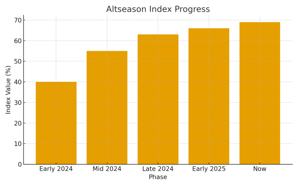 - The “Altseason Index” (a community metric estimating the altcoin share of gains over Bitcoin) has climbed to ~69 %, but remains just under the 75 % threshold many cite as confirmation of an alt season.