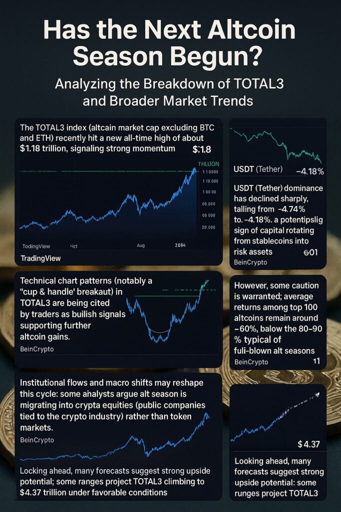 - The TOTAL3 index (altcoin market cap excluding BTC and ETH) recently hit a new all-time high of about $1.18 trillion, signaling strong momentum in the altcoin space.