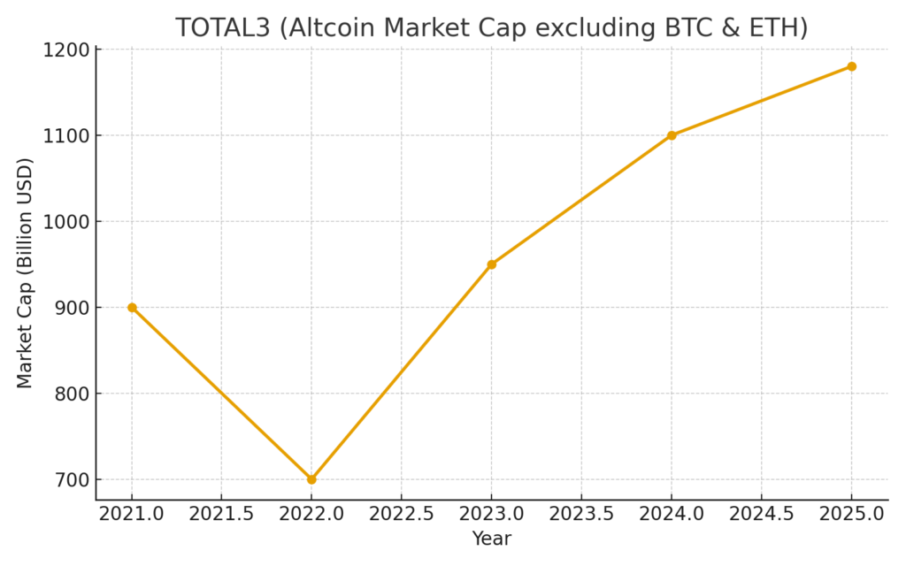 - Looking ahead, many forecasts suggest strong upside potential: some ranges project TOTAL3 climbing to $4.37 trillion under favorable conditions.