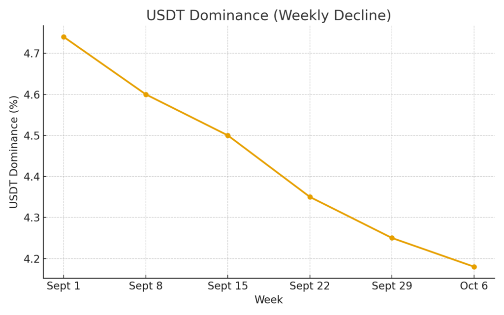 - USDT (Tether) dominance has declined sharply, falling from ~4.74 % to ~4.18 %, a potential sign of capital rotating from stablecoins into risk assets.