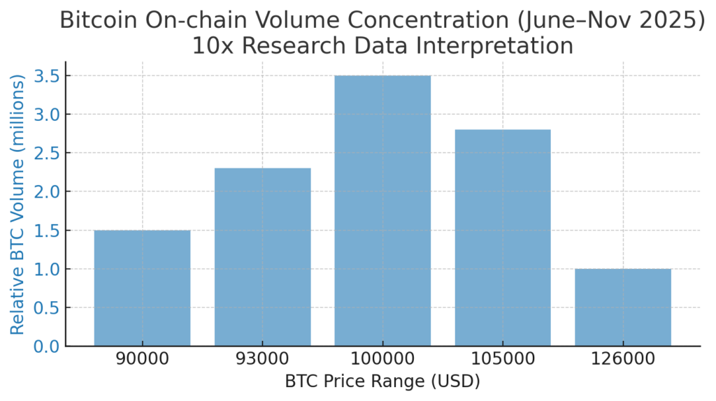 Since June 2025, Bitcoin has maintained a trading range roughly between $100,000 and $126,000. On the surface, this appears to be a period of consolidation or even stagnation. However, according to 10x Research, nearly 5.9 million BTC (≈ $58.8 billion) have moved within that range in recent months.