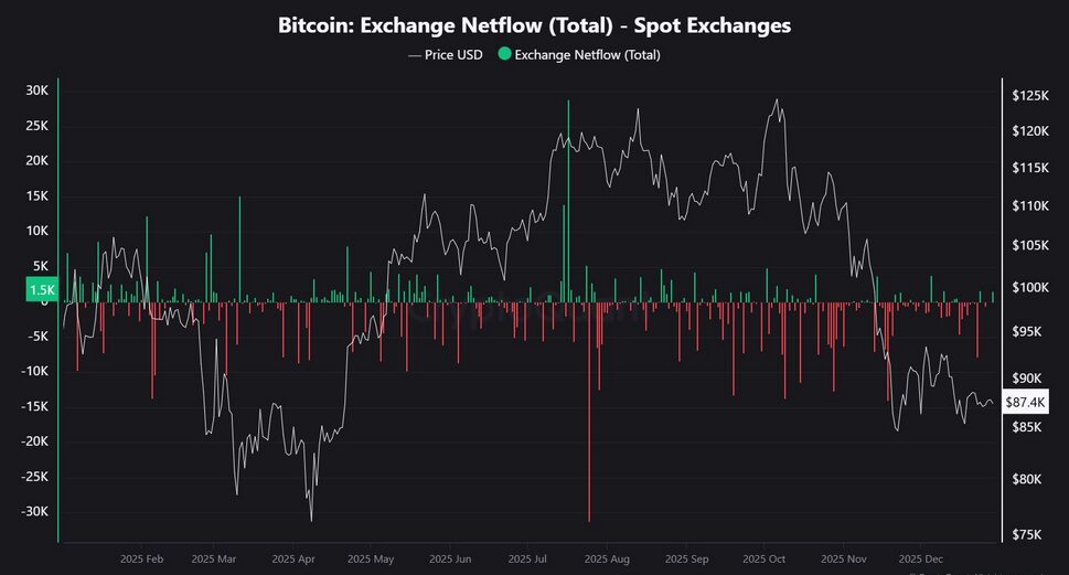Exchange Netflow measures Bitcoin inflows and outflows from centralized exchanges, offering a direct view of spot market supply pressure.