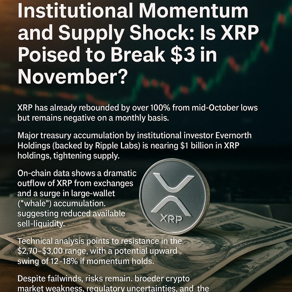 The landscape for XRP is at a potentially pivotal juncture. With institutional treasury accumulation via Evernorth, on-chain supply contraction, and a favorable technical structure, XRP might be preparing for a breakout toward the ~$3.00 level in November — representing 12–18% upside in the near term. For investors hunting new crypto assets or blockchain use-cases, this is a compelling scenario: XRP is evolving from altcoin status toward institutional infrastructure, increasing its appeal for both speculative and strategic holders.