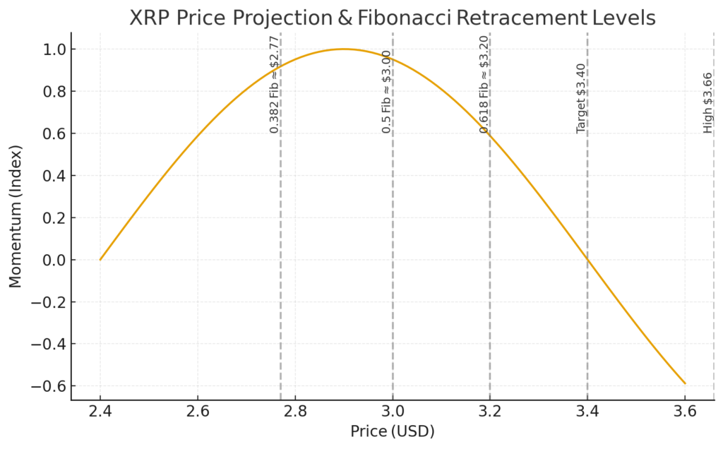 From a technical perspective, XRP’s previous surges (April, June) found support near the long-term trend and then rose into the 0.5-0.618 Fibonacci retracement band (~$3.20–$3.66). The current setup echoes that structure.