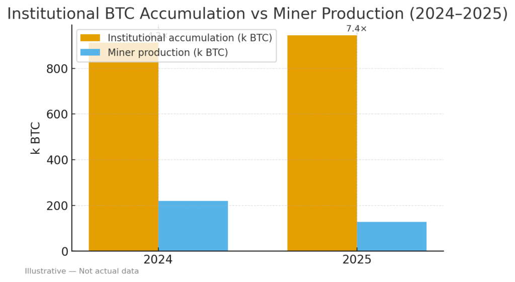 One of the most striking features of the current landscape is how institutional demand increasingly overshadows new issuance. In 2025 alone, institutions have accumulated nearly 944,330 BTC, surpassing the 913,006 BTC acquired in all of 2024. Meanwhile, miners have produced only about 127,622 BTC in that same interval, meaning institutional buying is outpacing supply by a factor of roughly 7.4×.