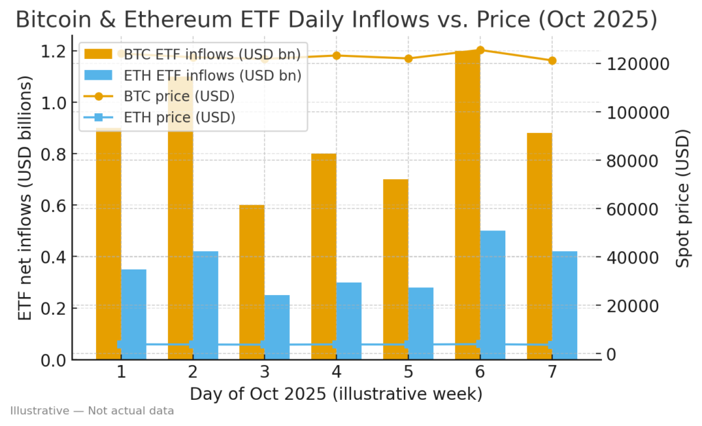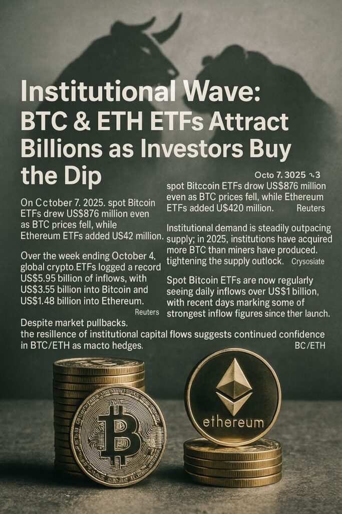 • On October 7, 2025, spot Bitcoin ETFs drew US$876 million even as BTC prices fell, while Ethereum ETFs added US$420 million.