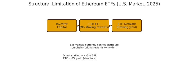 However, one limitation is that most U.S.-listed ETH ETFs do not support staking rewards within the trust structure. That means investors cannot yet capture ETH’s on-chain yield (staking APR) through these products, only price appreciation.