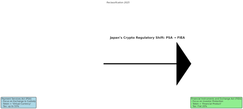 One of the most consequential reforms under consideration is the proposal to shift qualifying cryptocurrencies from the Payment Services Act (PSA) to the Financial Instruments and Exchange Act (FIEA) — effectively treating them as financial products or securities.