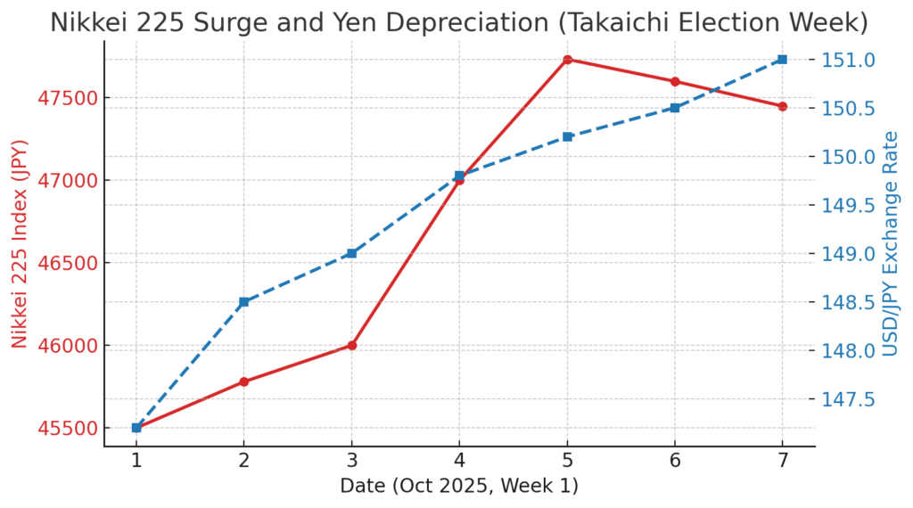 Observers have begun calling this the “Takaichi trade” — a positioning toward risk assets, yen depreciation, and higher inflation expectations.