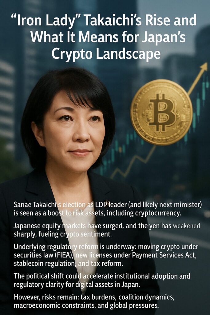 Sanae Takaichi’s ascent as Japan’s de facto next prime minister has catalyzed a wave of optimism across markets, particularly in the crypto space. The combination of fiscal ambition, anticipated monetary stimulus, and regulatory reform could meaningfully shift Japan’s ecosystem.