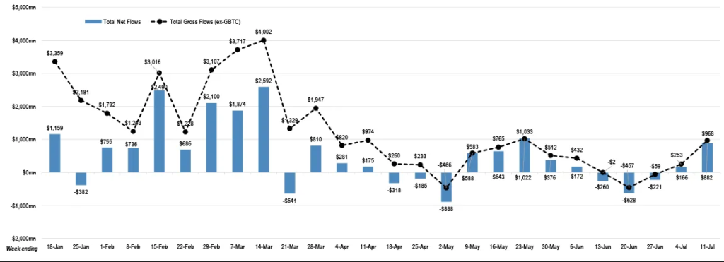 While net outflows continued, Butterfill emphasized that the pace of capital leaving the market has slowed markedly. In the two preceding weeks, total net outflows exceeded $1.7 billion per week, making the latest figure a notable deceleration.