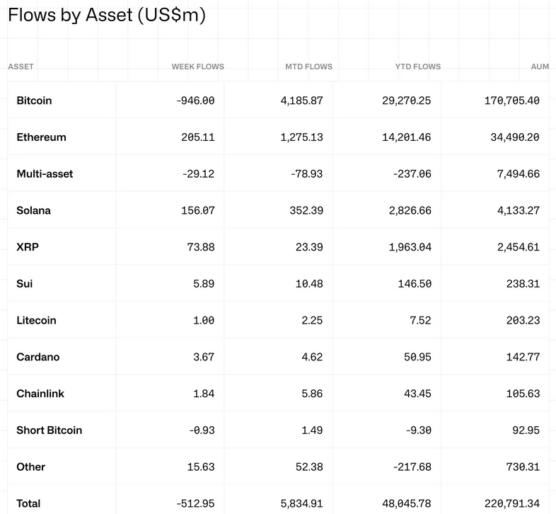 Butterfill highlighted that while Bitcoin-linked products continued to experience net outflows, capital has clearly rotated into select altcoins.