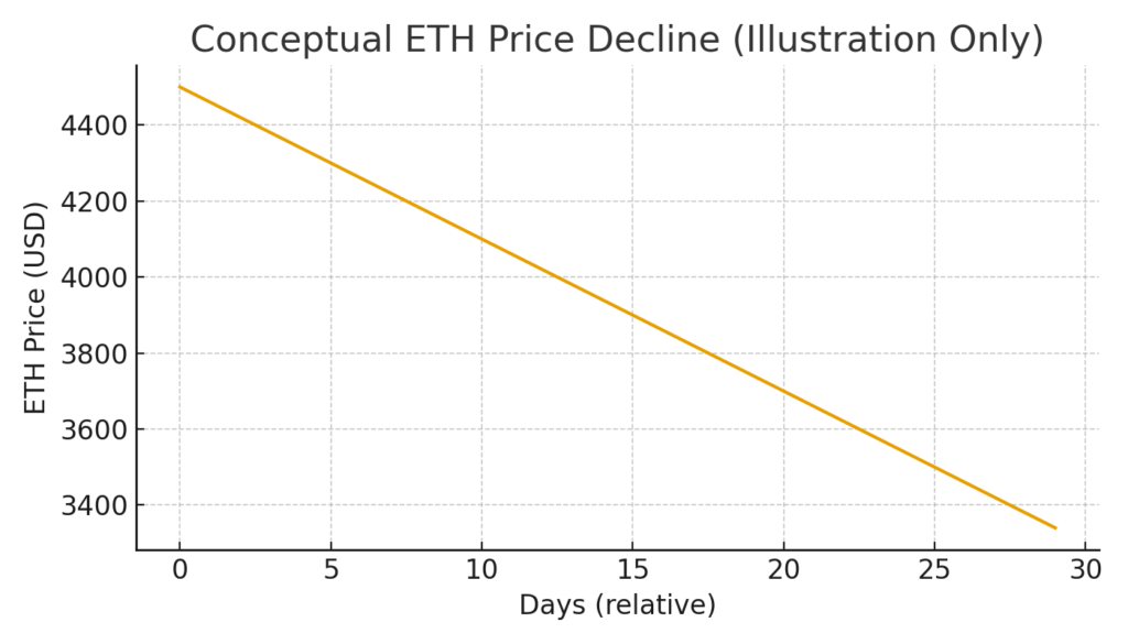 Since October 6, ETH has experienced a drop exceeding 35 %, delivering a heavy blow to speculative sentiment and triggering a wave of forced liquidations. The reported crash (from the original Japanese source) aligns with data showing ETH dropping to around $3,300 in early November before bouncing slightly. According to one report, ETH traded near $3,200 on November 17, 2025. Meanwhile, as of November 11, ETH fell below $3,590, reinforcing a new lower trading range.
