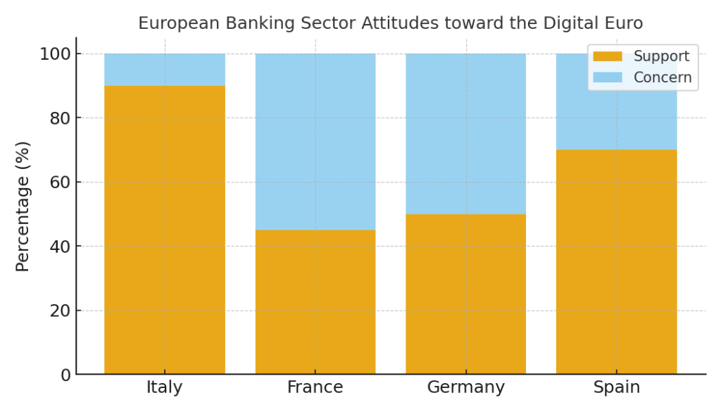 In contrast, banks in France and Germany have voiced concerns that a retail digital euro could lead to deposit outflows from commercial banks into ECB wallets, weakening banks’ credit-intermediation role. Italian banks appear more willing to support the project, perhaps seeing long-term strategic benefit in gearing infrastructure accordingly, subject to manageable cost profiles.