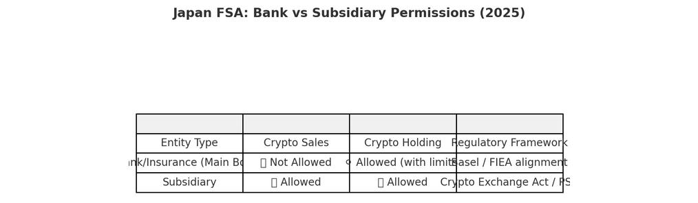 Recent reporting confirms that the FSA is seriously considering allowing banking-group subsidiaries to register as crypto service providers and allow banks to invest in crypto under conditions.