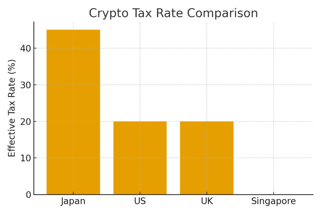 Today, crypto gains in Japan are categorized as miscellaneous income and included under comprehensive taxation, which can push high-income traders into rates as high as 45%.