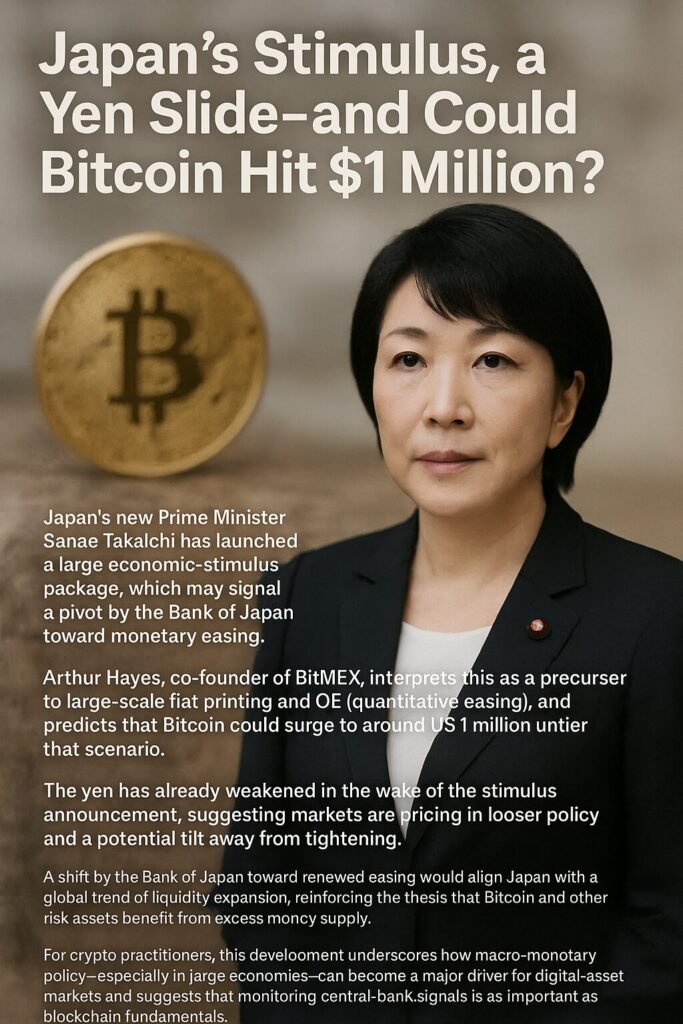 The cryptocurrency-market community now has an intriguing scenario in play: Japan’s new stimulus under Prime Minister Takaichi may trigger a revival of monetary easing, which in turn could feed substantial liquidity into global risk-assets — including Bitcoin. Arthur Hayes’s bold projection of Bitcoin reaching US $1 million may be more symbolic than a forecast, but the logic behind it is serious: more money printing, weaker fiat, and capital looking for alternatives.