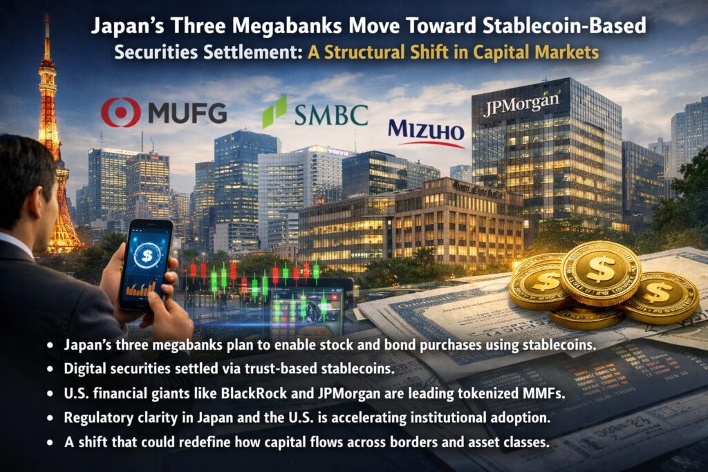 Japan’s three megabanks moving toward stablecoin-based securities settlement marks more than a technological experiment. It is a strategic repositioning in global capital markets.