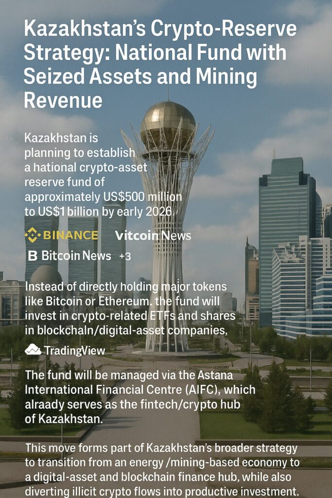 Kazakhstan plans to launch a national cryptocurrency reserve fund with a target capitalization between US$500 million and US$1 billion, operationally slated for early 2026. The idea is to harness value from existing digital-asset flows — namely seized assets from financial crime and licensed mining operations — and channel them into institutional-style investment vehicles tied to crypto and blockchain infrastructure.This is less about immediate token speculation and more about establishing a durable foothold in the digital-asset economy.