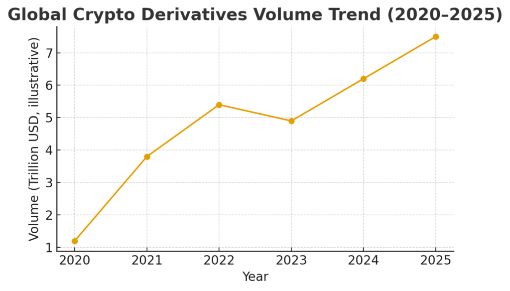 Analysts estimate the global derivatives markets (traditional + crypto) will be measured in the tens of trillions, with crypto derivatives a growing share.