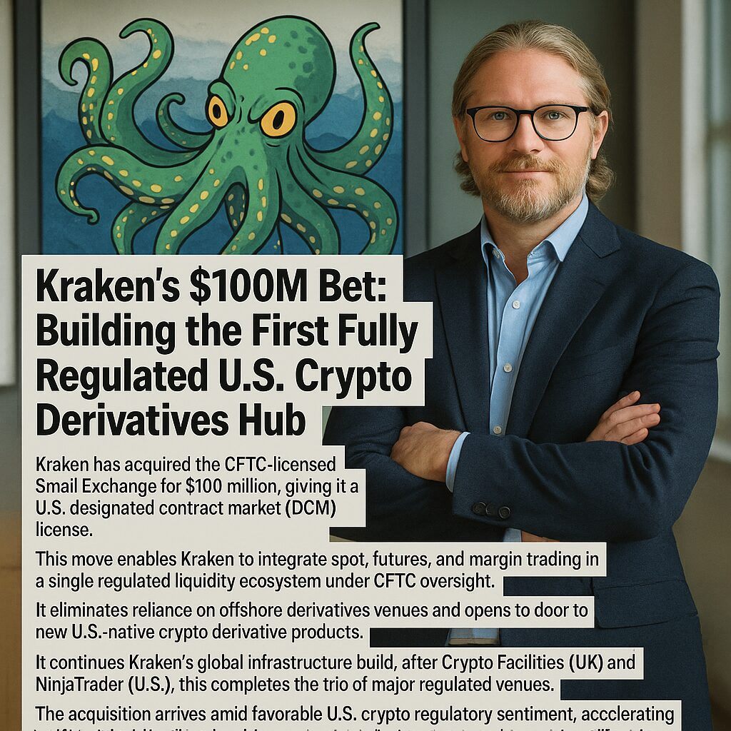 On October 16, 2025, Kraken announced it had acquired Small Exchange, a U.S. futures exchange regulated by the Commodity Futures Trading Commission (CFTC), for $100 million (a mix of cash and stock). This acquisition gives Kraken control of a Designated Contract Market (DCM) — essentially a regulated venue on which futures and options contracts can be listed in the United States under CFTC supervision.