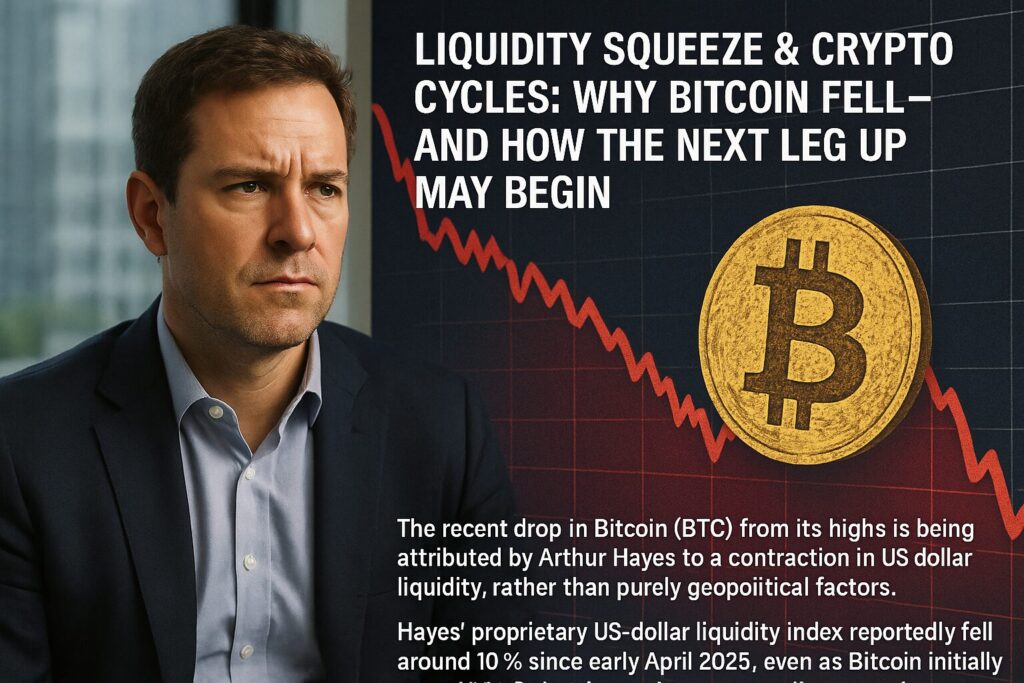 - Hayes’ proprietary US-dollar liquidity index reportedly fell around 10 % since early April 2025, even as Bitcoin initially rose ~12 % during the same period—a divergence Hayes sees as unsustainable.