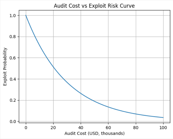 A graph illustrating how incremental audit spending significantly reduces exploit probability, highlighting diminishing marginal risk.