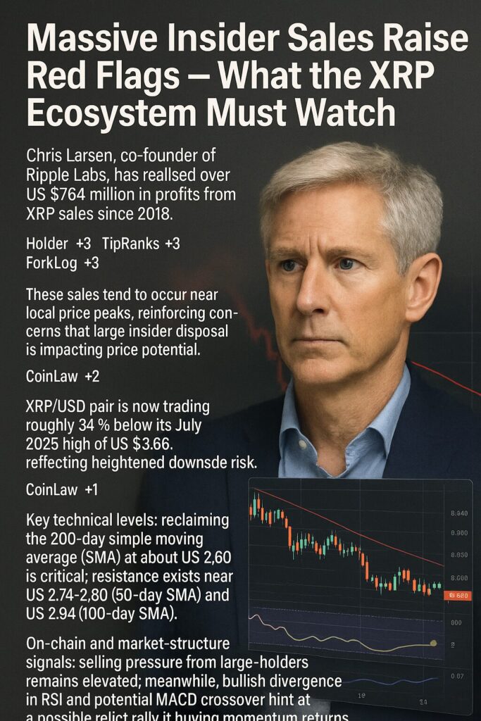 The recent revelation that Chris Larsen has realised over US $764 million in profits from XRP sales since 2018 is more than just headline-grabbing—it underscores structural risk in the XRP ecosystem that both yield-seeking investors and blockchain practitioners must recognise. While the token retains meaningful utility in cross-border payments and DeFi infrastructure, the combination of insider disposition, large-holder outflows, and technical weakness implies that timing matters significantly.