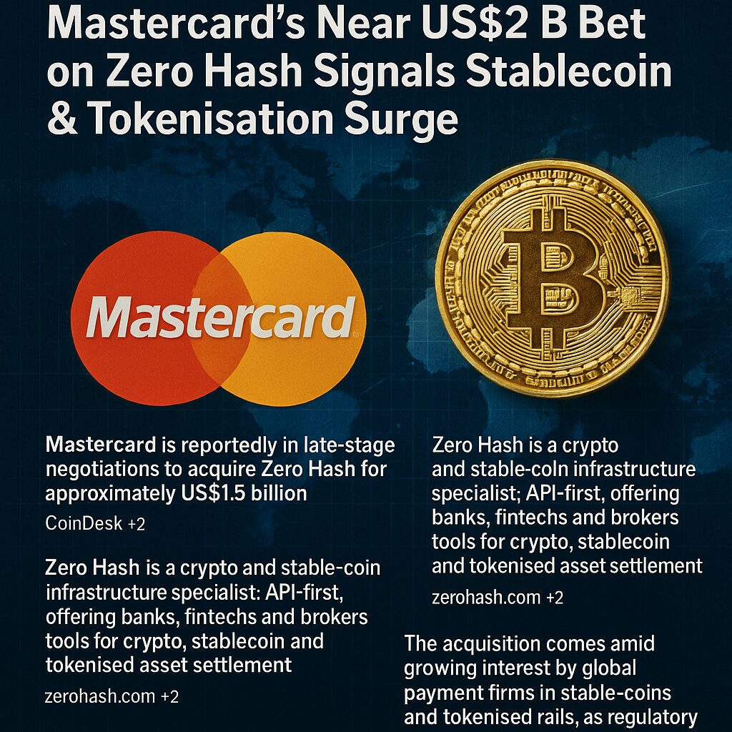 The reported acquisition of ZeroHash by Mastercard for up to $2 billion marks a watershed moment in crypto and payments infrastructure. It underlines the shift from crypto being a fringe asset class toward stablecoins, tokenisation and blockchain rails being central to the next generation of global payments. For investors and builders, this means the real action lies not just in speculative tokens, but in the plumbing of blockchain finance: token-issuance, settlement, and infrastructure. The journey ahead will reward those who understand how traditional finance meets blockchain—wallets like yours (dzilla Wallet) that integrate tokenised assets, stablecoin rails and institutional flows may well capitalise on this trend. As stablecoin regulation becomes clearer and institutional flows rise, the next crypto infrastructure cycle is likely already underway.
