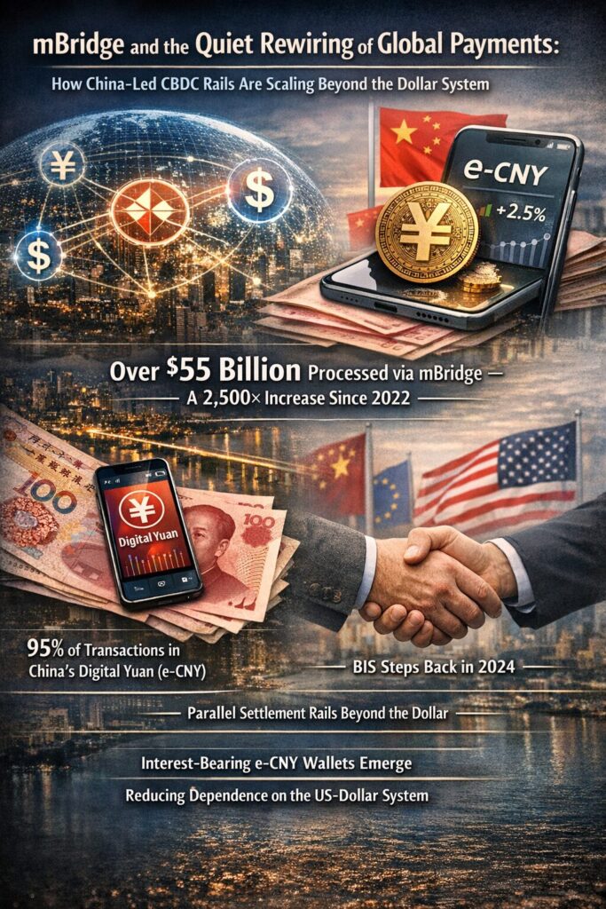 The rise of mBridge is not about headlines or ideological confrontation. It is about plumbing—the underlying infrastructure that determines how money moves across borders. By quietly scaling to more than $55 billion in settlements, mBridge demonstrates that CBDCs can function as real, high-value payment rails today.