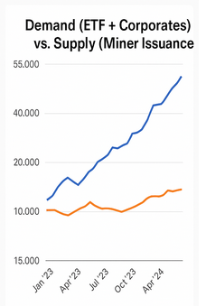 Michael Saylor has publicly noted that in 2025, businesses are reportedly acquiring 1,755 BTC per day, while ETFs are acquiring another 1,430 BTC per day—figures which outstrip daily miner issuance. n other words, demand from treasuries and passive instruments now exceeds supply from mining alone—a potential tipping point.