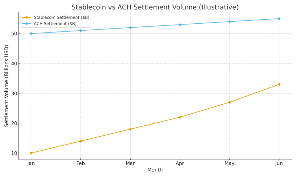 According to market data, stablecoin settlement volumes now rival or exceed some traditional ACH payment flows. To illustrate: