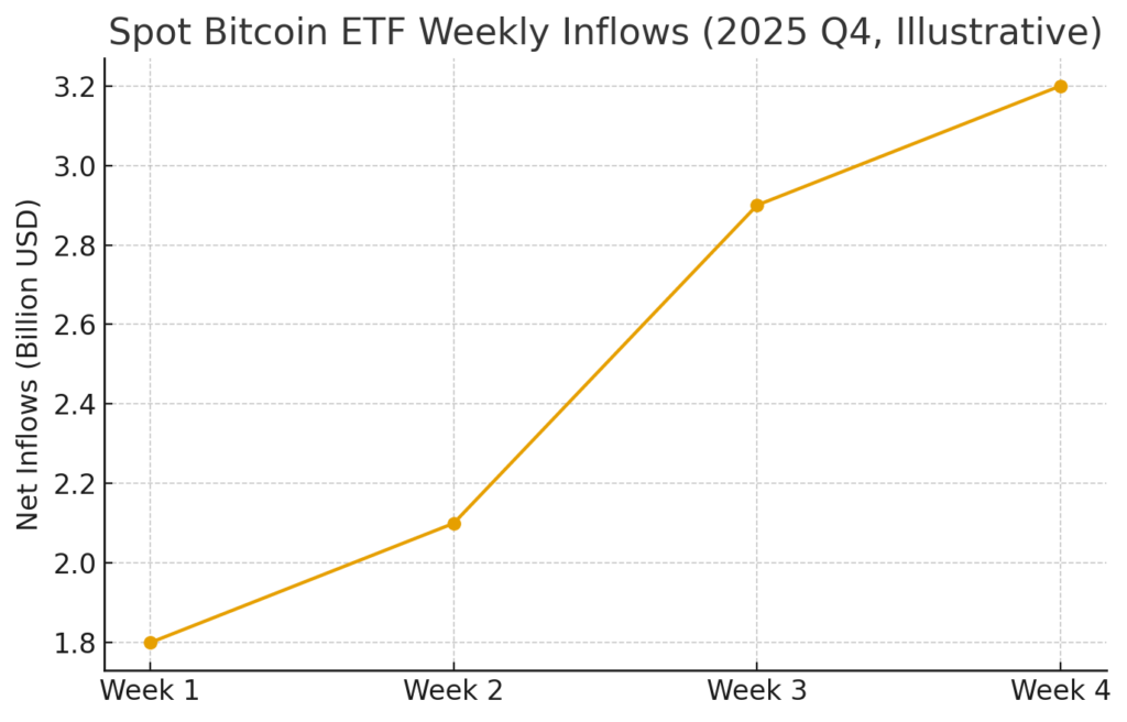 One of the strongest pillars of bullish forecasts is the rapid inflows into spot Bitcoin ETFs. Reports indicate that in 2025, weeks with over $3 billion net inflows are becoming more common — for example, in early October, spot ETFs aggregated $3.24 billion in net inflows, nearing historical highs.