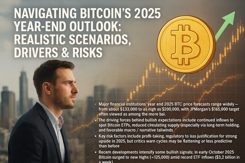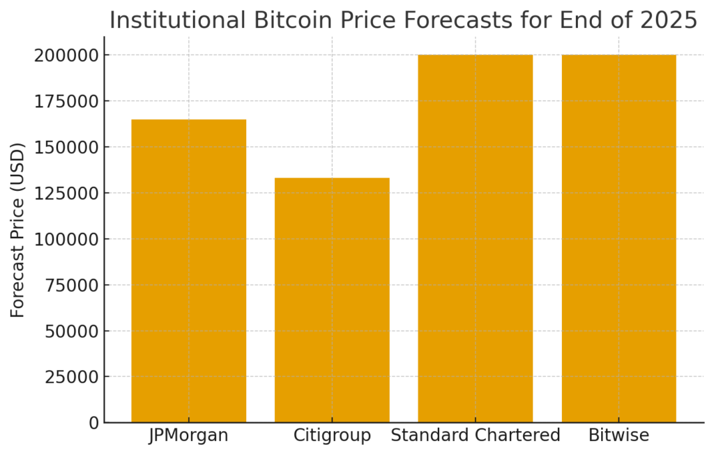 - Institutional forecasts for Bitcoin’s year-end 2025 price span from around $133,000 up to $200,000, with JPMorgan’s $165,000 often cited as a balanced anchor.