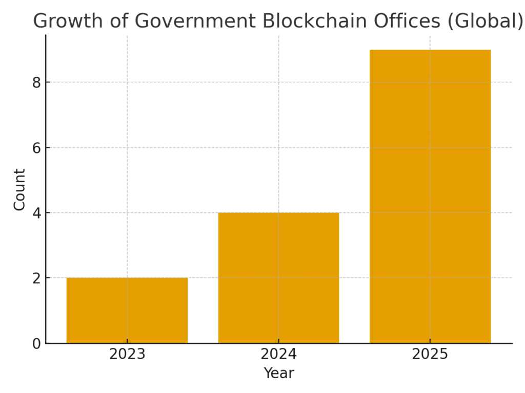 • State-level initiatives: Several U.S. states have accelerated blockchain policy and regulation. For instance, Wyoming introduced its own stablecoin (FRNT), California has authorized crypto-based payments for government services, and Louisiana has established a subcommittee merging AI, blockchain, and crypto in state governance.