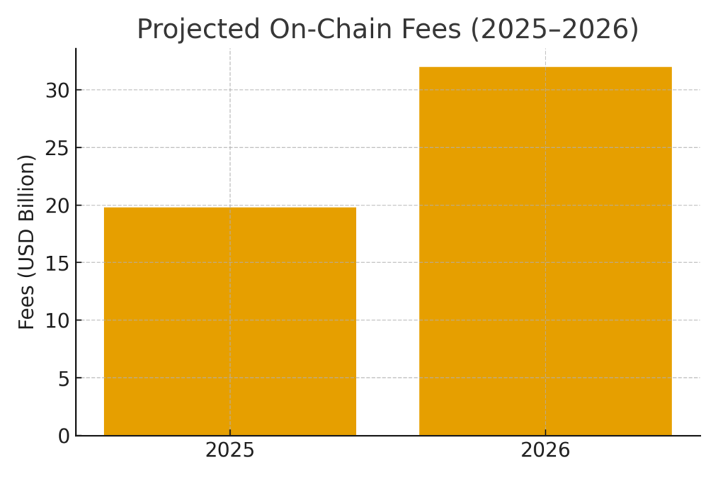 - Projections for 2026 suggest on-chain fees could reach about $32 billion, driven by the application layer of the ecosystem.