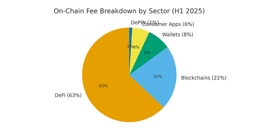 - Breakdown by sector (H1 2025): DeFi protocols accounted for approximately 63 % of total fees (~$6.1 billion). Blockchains ~22 %, wallets ~8 %, consumer applications ~6 %, while DePIN and middleware made up ~1 % each.