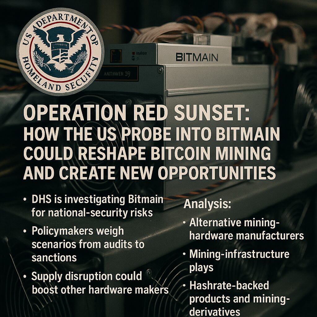 - The US Department of Homeland Security (DHS) is running a national-security investigation, “Operation Red Sunset,” into Chinese mining giant Bitmain, focusing on whether its Bitcoin mining rigs could be remotely controlled for espionage or power-grid sabotage.