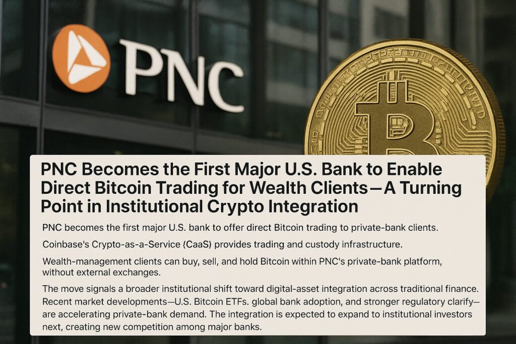 PNC Becomes the First Major U.S. Bank to Enable Direct Bitcoin Trading for Wealth Clients — A Turning Point in Institutional Crypto Integration