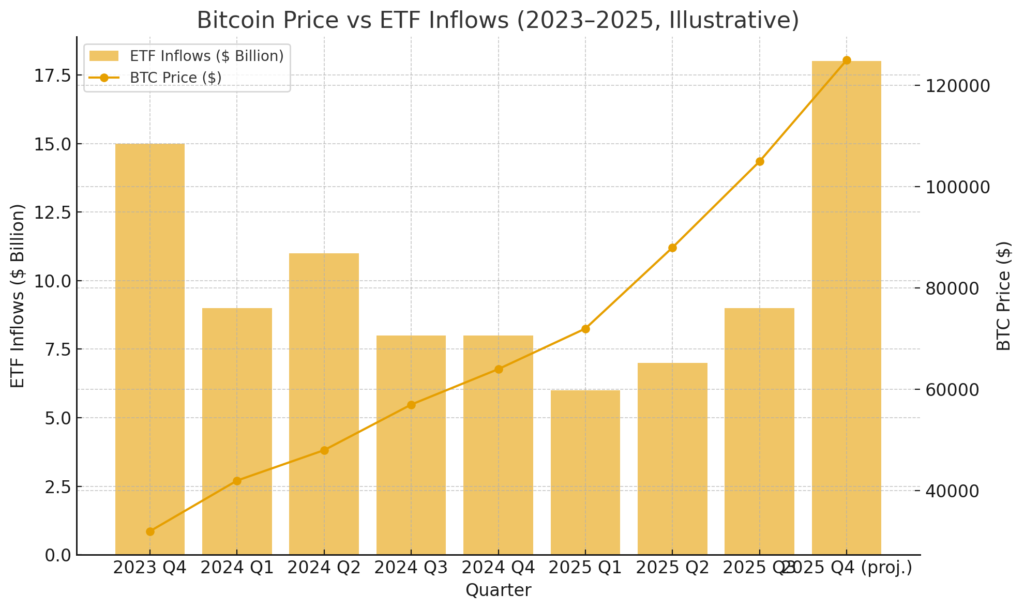 A third key driver is Bitcoin’s recent strength. BTC surged past $125,000 in early October 2025, before consolidating in the $122,000–$123,000 range. Historically, quarters with double-digit BTC returns often coincide with large inflows into Bitcoin ETFs (i.e. billions in capital entering).